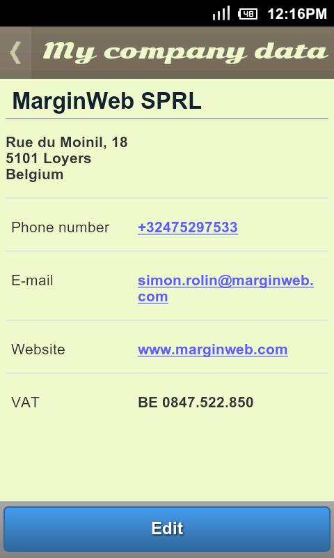 You can also present your company’s data as a “business card”. This way you can show all the relevant information to people who need to make invoices for you. It contains the company’s name, address, phone number, email, website and VAT number.