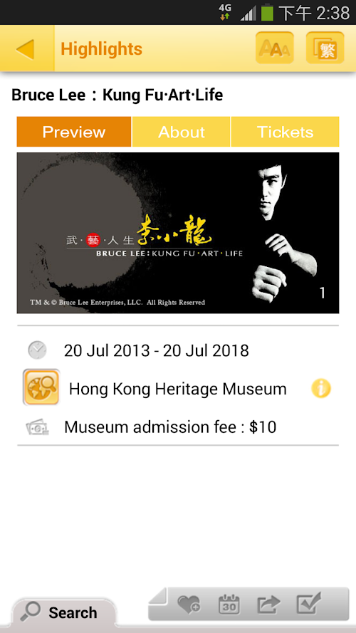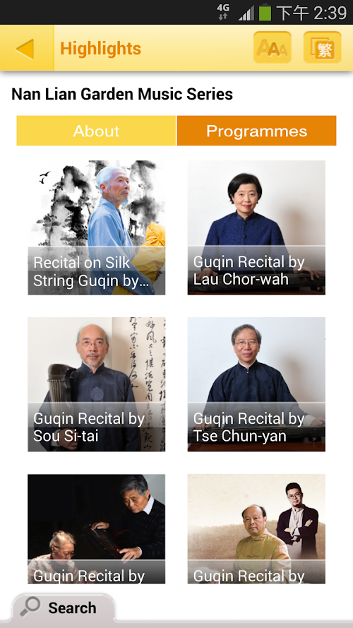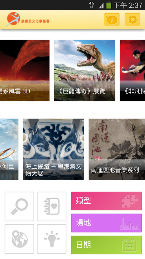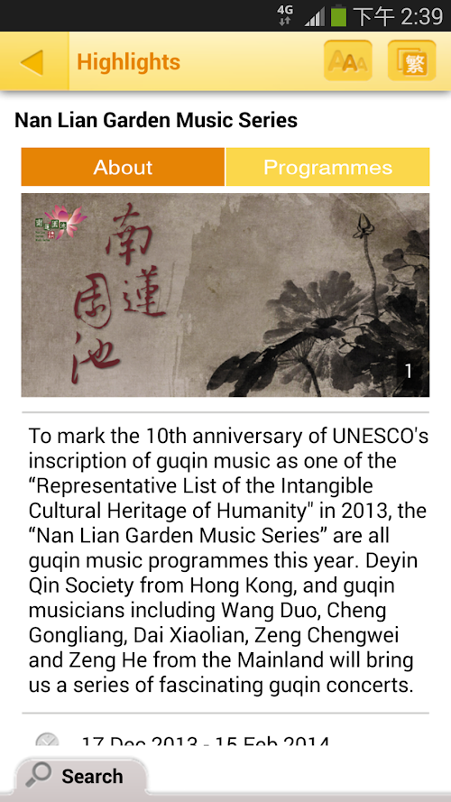 The app covers cultural presentations organised solely or jointly by LCSD and sponsored programmes under the Venue Partnership Scheme. It also covers film programmes and museum special exhibitions organised by LCSD. The app aims mainly to disseminate brief programme information to users in a user-friendly manner. Major functions include:
