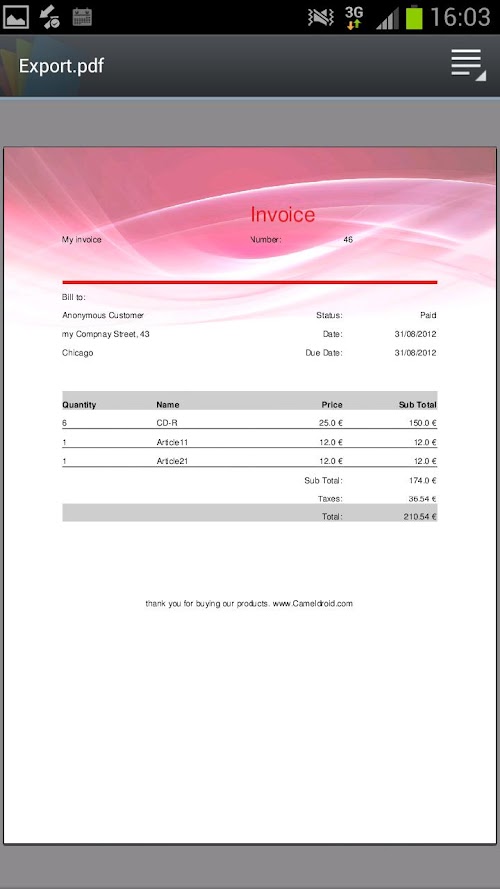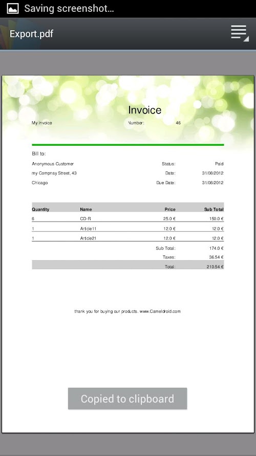 - All pdfs generated are saved on your sd card: sdcard/CamelDroid/Invoices/Export