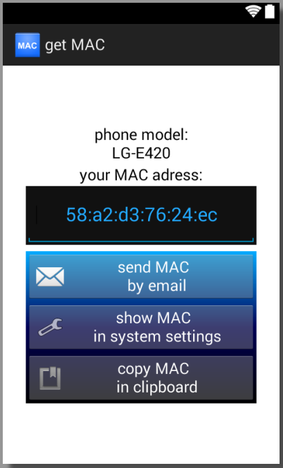 When the device is connected to a WiFi network administrators are asked to tell them the MAC address of your phone or tablet. The program detects it and makes it possible to send e-mail or copy it to the clipboard for pasting into any message, such as Skype.