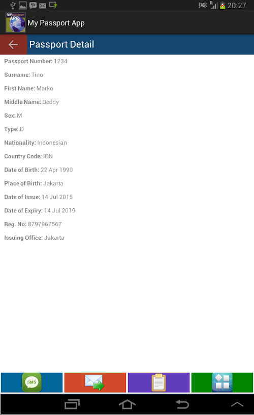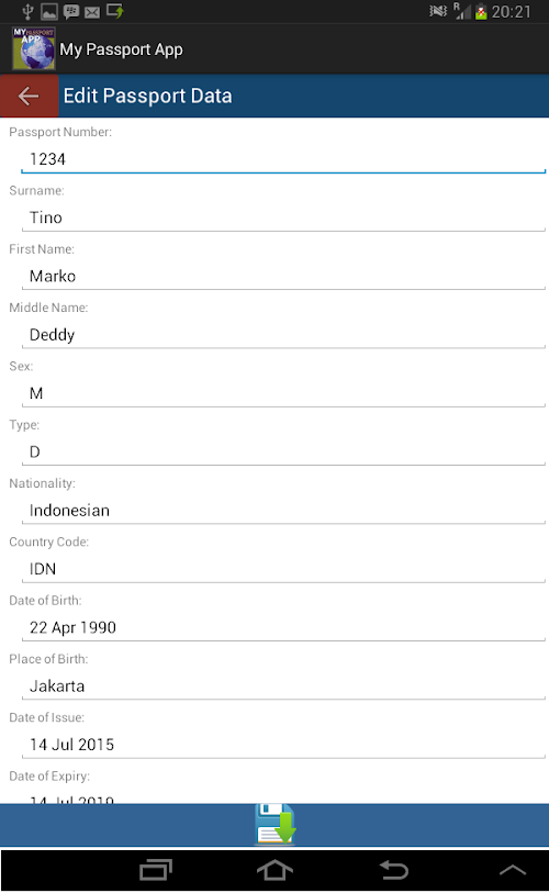 This application aims to help travelers, individual or corporate to save the information of their passport. When planning to travel, you might need to send your passport detail via SMS, email or other form of communications to book a hotel, flight or simply to ease you from remembering the detail of your passport.