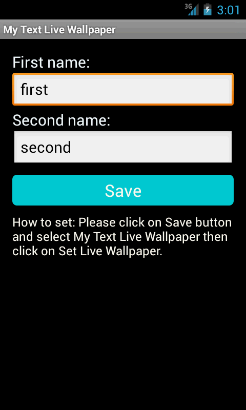 How to Set: Open App ==> Set Name==> Write your first name and second name ==> Save ==> It will goto Live Wallpapers ==> Now choose from Live wallpapers "My Text Live Wallpaper".