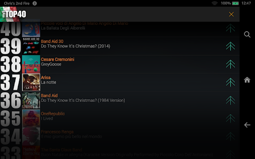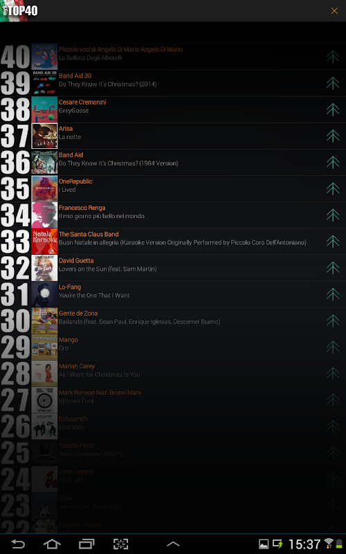 Keep track of the Top 40, watch the official YouTube music videos, preview & buy songs from Amazon. featuring: Lorenzo Fragola,Marco Mengoni, Madh, Fedez feat. Francesca Michielin, Sister Cristina, Ilaria, Mario, Enrique Iglesias, Hozier, The Avener, Hozier, Meghan Trainor, Sia, Piccolo Coro Le Brentelle Enrico Turetta, David Guetta, Lilly Wood & The Prick and Robin Schulz, AronChupa, Band Aid 30, Echosmith, Tiziano Ferro, The Santa Claus Band, OneRepublic, John Legend, Mango, Francesco Renga, Spada & Elen Levon, Elisa, David Guetta, Lo-Fang, Mariah Carey, Gente de Zona, Mark Ronson feat. Bruno Mars, Sheppard, Cesare Cremonini, Wham!, David Guetta, Piccole voci di Angelo Di Mario Angelo Di Mario, Renato Giorgi Daniela Cologgi, Mango, Arisa, Leiner, Saint Motel & many more