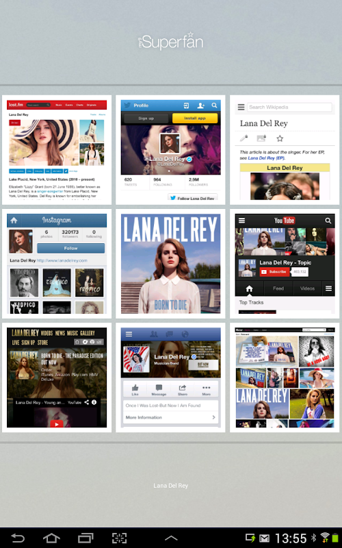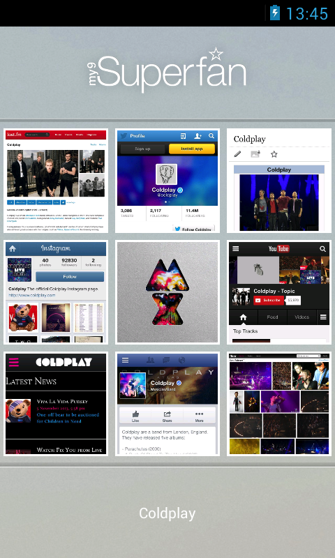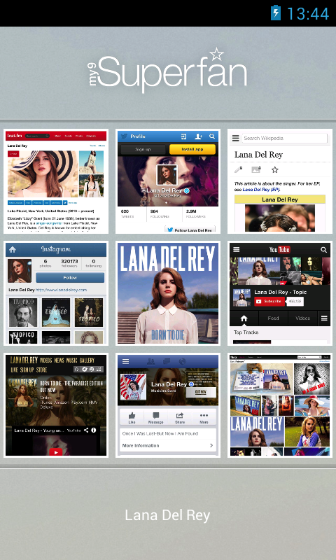 my9superfan (my9sf) is a social music powerhouse, combining live feeds from twitter, facebook, youtube, instagram, flickr, wikipedia & last.fm, plus the artist's own website, TOGETHER, on one screen, IN A FAST, EFFORTLESS AND UNIQUE WAY. IT'S THE ultimate in-App fan browsing experience.