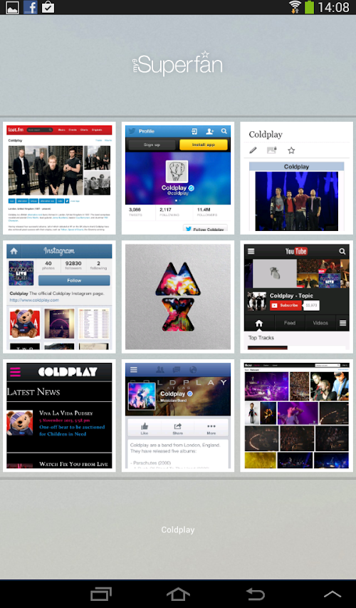 • browse twitter, facebook, youtube, instagram, flickr, wikipedia, last.fm, official websites, from one grid