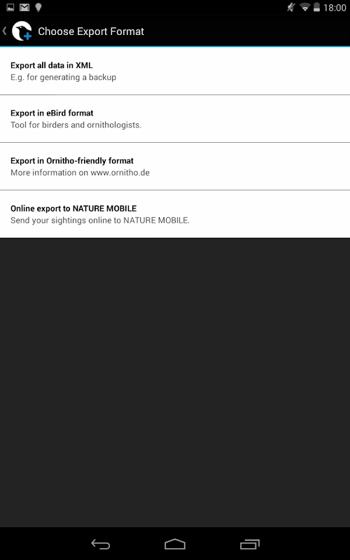 Note for ornitho.de: Data from events and sightings can be imported into myBirdList from ornitho.de in XML format via email or iTunes and exported from myBirdList in different formats. An export of your data to ornitho.de (i.e. importing your data into ornitho.de) is not yet possible.