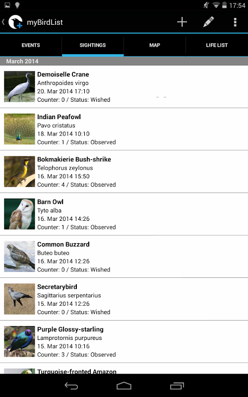 "My Life List" contains all bird species you have seen in your lifetime. This list is automatically generated from all inserted sightings and provides summary view for periods like the current month and year. Each species entry in this list leads directly to the respective sightings.