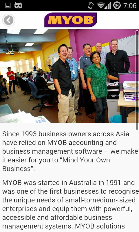 MYOB was started in Australia in 1991 and was one of the first businesses to recognise the unique needs of small-tomedium- sized enterprises and equip them with powerful, accessible and affordable business management systems. MYOB solutions were aimed at alleviating an increasing administrative burden and giving business owners the necessary insights to run their businesses more successfully. From day one, MYOB has maintained a constant focus on providing quality client support to ensure businesses gain maximum return from their investment.