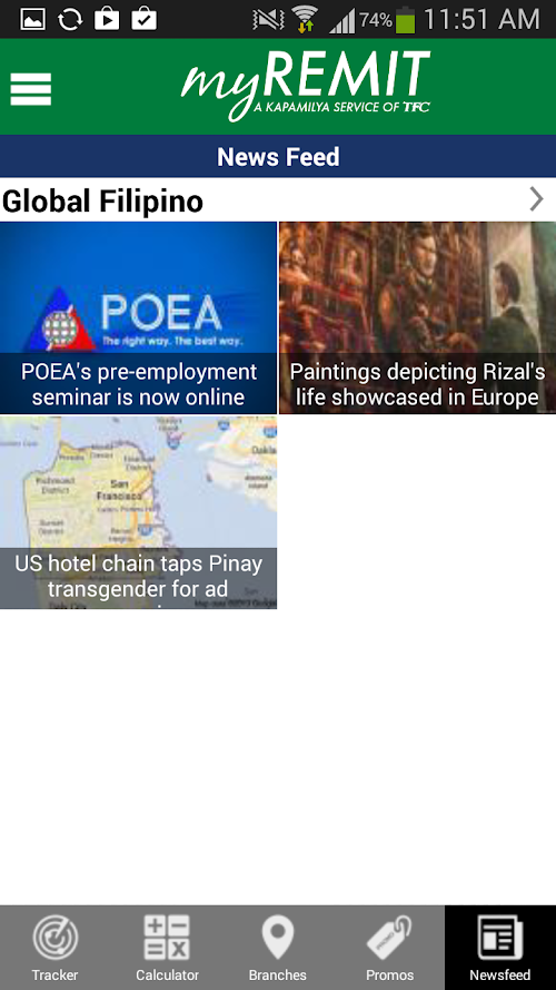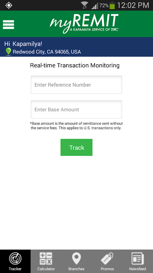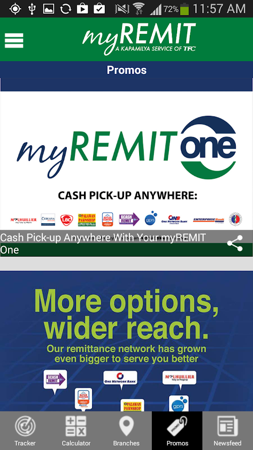 The new myREMIT app is a free downloadable app that allows you to conveniently track your remittance transaction on the go - 24/7. Conveniently check estimated foreign exchange rates, calculate remittance transactions and find myREMIT branches and tie-ups nearest you all via your mobile phone.
