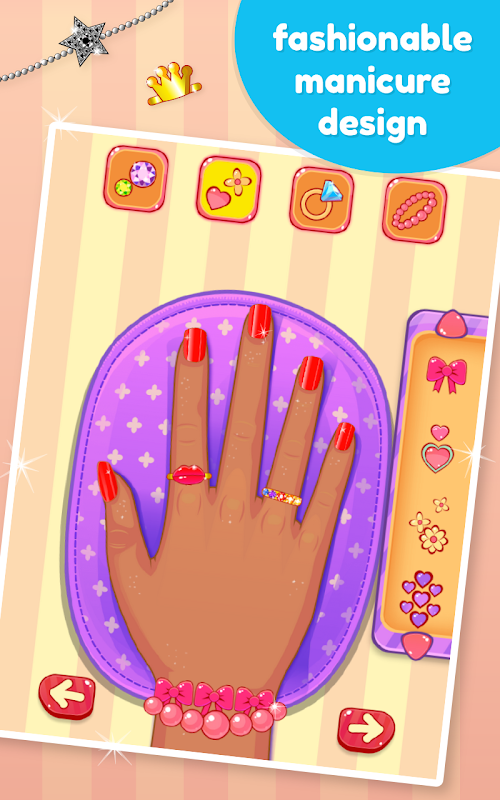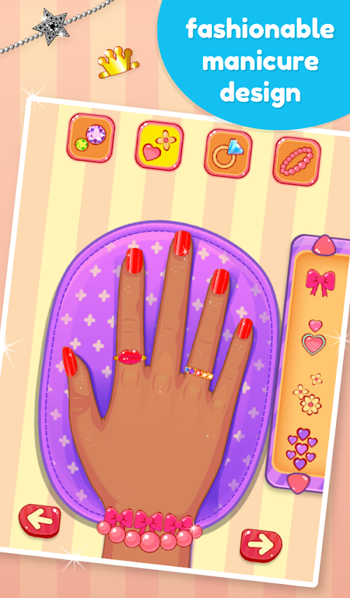 After general nail care, you can finally do your nails, one by one. You have many beauty products at your disposal, for example nail polish of different colours, nail polish removers, stickers, diamonds, glitters and sprinkles, in the end you can even decorate your hand with rings and bracelets.