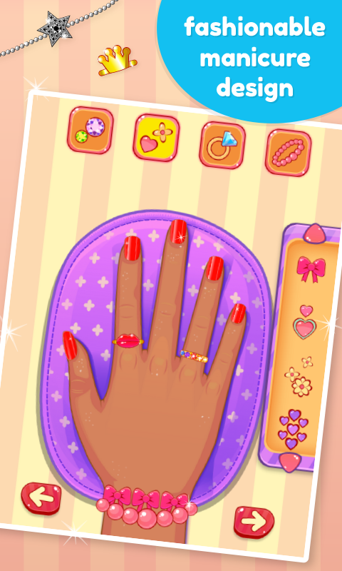 We have a perfect opportunity for you to make your own fashionable manicure design. Choose a skin tone to start a game. At first, you have to shape your nails with nail-clipper. Than take care of your cuticles with a special stick so you will not have any problems with it. Use a trendy nail file to perfectly shape each nail. After that smear drops of oil all over the hand until it becomes glossy and shiny.