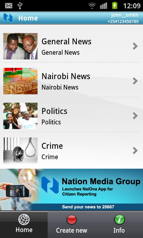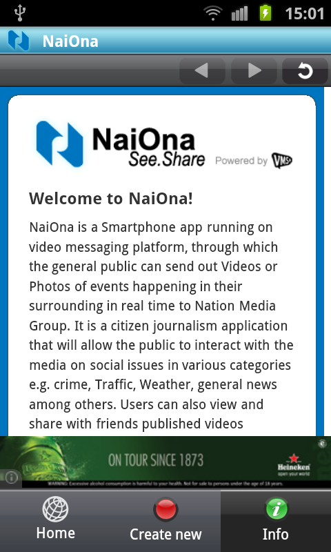 NaiOna is a Smartphone app running on a video messaging platform, through which the general public can send out Videos or Photos of events happening in their surrounding in real time to Nation Media Group. It is a citizen journalism application that will allow the public to interact with the media on social issues in various categories e.g. crime, Traffic, Weather and general news etc. Users can also view the published videos and share them with friends through this application on Twitter, Facebook and Telephone Numbers.