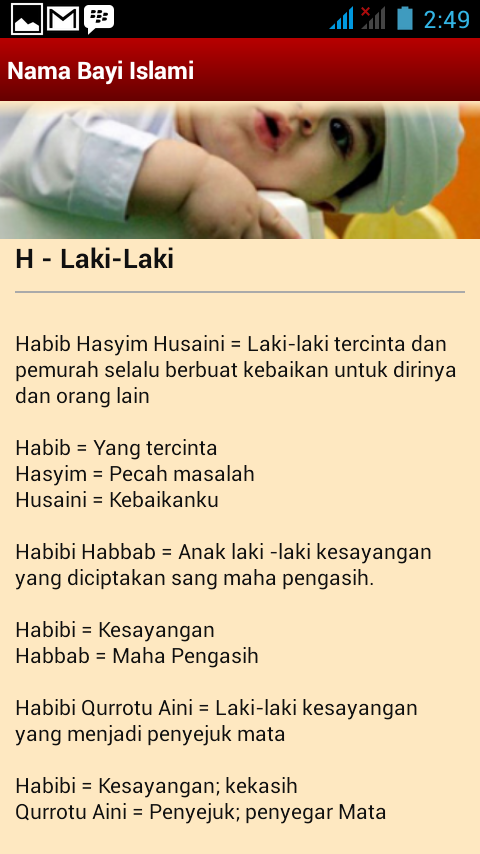 - Karena nama bayi Islam adalah dalam bahasa Arab, dianjurkan untuk memilih nama yang mengandung huruf-huruf Arab yang mudah diucapkan oleh lisan "Endonesia" secara benar, sehingga tidak merubah arti nama tersebut :-)Baby Name Islami is a complete reference collection for baby boy names and baby girl names neatly arranged in alphabetical order (AZ) in addition to the added also tips on choosing a baby name that is both Islamic.