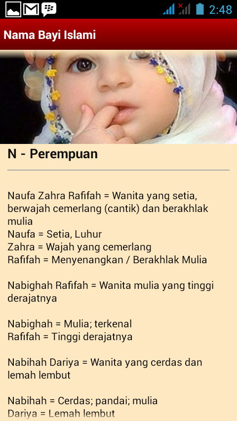 Nama Bayi Islami adalah kumpulan referensi lengkap untuk nama bayi laki-laki dan nama bayi perempuan tersusun rapi berurutan sesuai dengan abjad (A-Z) selain itu ditambahkan juga tips memilih nama bayi yang baik secara islami.