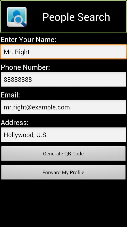 QR Code, Business Card: Generate and show a QR Code picture according to your profile (Name, phone number, email, address), and you can forward your profile to other people.