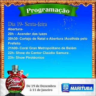 Após a montagem e início do evento uma grande programação cultural será agregada aos pontos temáticos, como bandas, corais, cortejos e peças teatrais, que serão apresentadas sempre de quinta a domingo na praça central do município, a partir das 20hs. Entre as atrações confirmadas estão o Coral Grand Metropolitano de Belém, os Tenores maritubenses Mário Ícaro e Bruno Carrera, Simone Almeida e Banda e o cantor Nilson Chaves. A programação se entenderá até o outro lado da BR 316, no novo Ginásio Poliesportivo de Marituba, onde serão montados os brinquedos para as crianças. Já o fundo do ginásio será usado como estacionamento. A expectativa da organização é de que pelo menos 200 mil pessoas visitem o município no período festivo.
