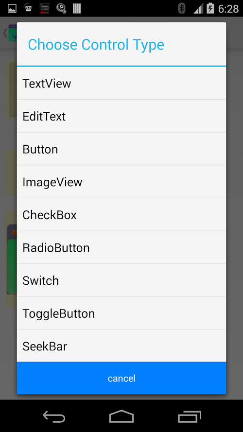 UI Control Include: Text View, Button, Edit Text, Image View, Radio Button, Switch, Toggle Button, Seek bar, Rating bar, Spinner, List View, Web View.