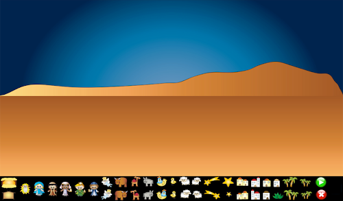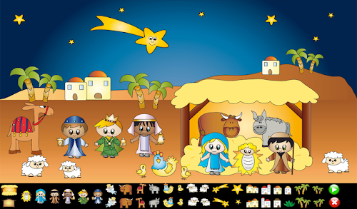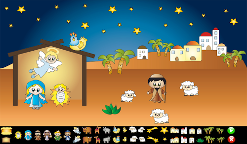 Kids will love to create their very own Nativity Scene using 40 different items. Just drag and drop the items at the desired spot and let your Nativity Scene glow! Once you have finished, touch the music button to hear one of five different Christmas carols!
