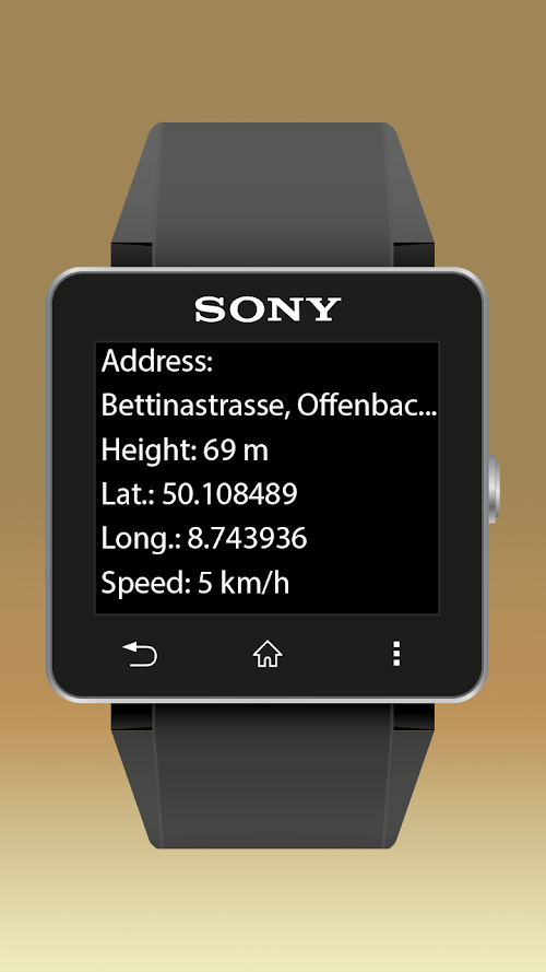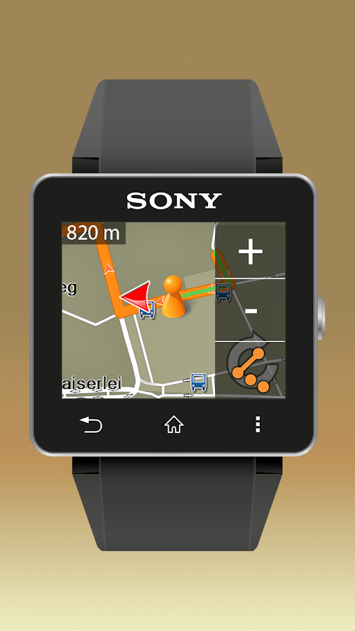 NAVIGON Smartwatch Connect is an extension that brings pedestrian navigation information from your smartphone(a) to your SONY SmartWatch 2 (b). It shows you the distance to your destination, a map with your current position, the route ahead and the one already passed. Refreshing to display your updated position is at your fingertips as well as zooming the map in or out to get the best overview of your location. If no pedestrian navigation is running general GPS information is displayed.