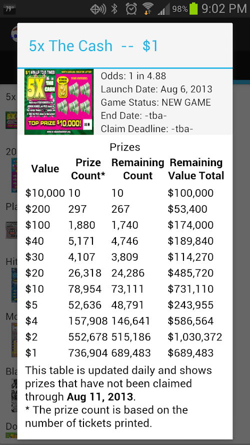 Click on Scratch off ticket for more details: prize values, prize count, remaining prizes, game status, launch date, end date and claim deadline