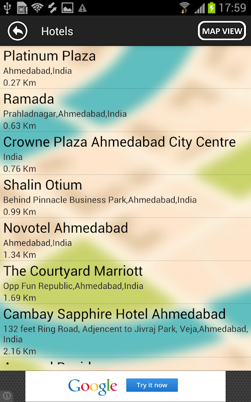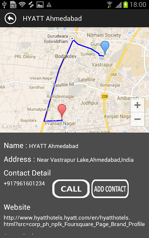 -> Displays details of places such as address, phone numbers, distance from current location, etc. for the results from within the app.