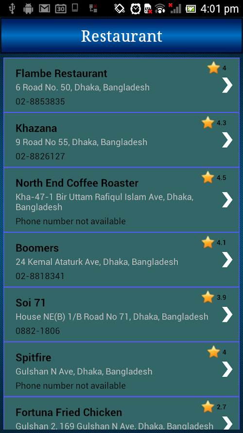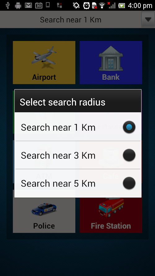 It works based on your current location.Once you found the place, you can then find the location details such as rating, address, telephone, direction. You can select the searching distance (such as 1 KM, 3 KM, 5 KM) from your current location.
