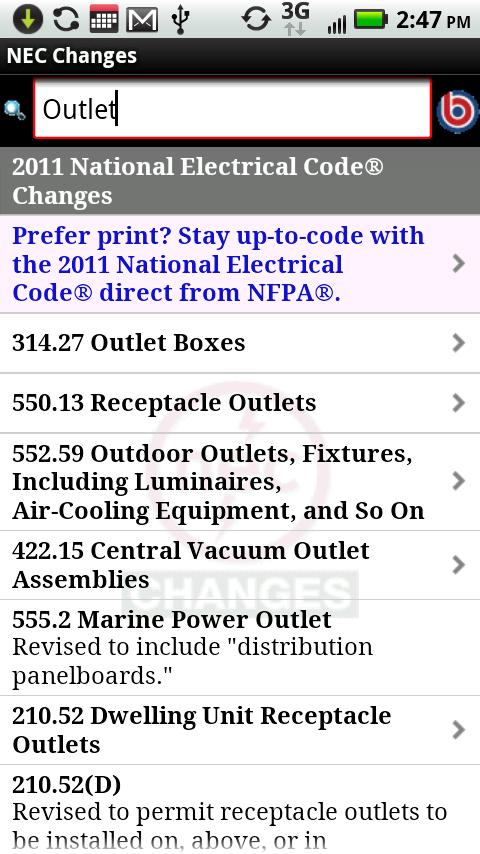 View the 2011 National Electrical Code® Changes here! Search specific NEC® Changes by article, connect to the Codes and Standards RSS feed, contact NFPA®, and more! Over 500 NEC Changes are right here at your fingertips.