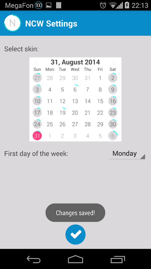 Now you can change 1 of 2 widget skins and select first day of the week in settings screen.