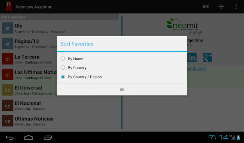 * Tab "World" - Search news sites from a lot of countries: Now Neonews search let find news sites from others countries, allowing select News WebSites as fovourites from differents regions around the World. The search allows you to use more than one word to narrow the search of Websites News, so you can group in your favourites, all news sites in the country you want.