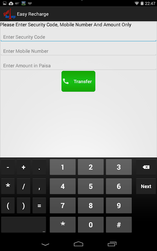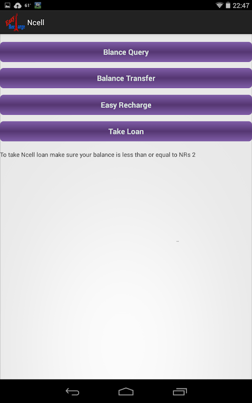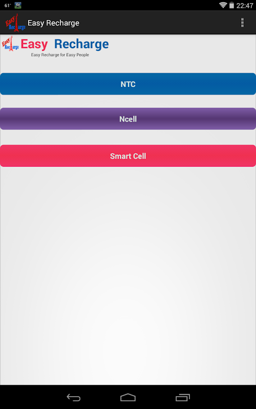 Easy Recharge is an easy mobile balance recharger app. Design and Developed for Nepali market. Has listed all three pre-paid service provider of Nepal i.e Nepal Telecom, Ncell and Smart Cell. Easy and hassle free to query balance, recharge and transfer balances.