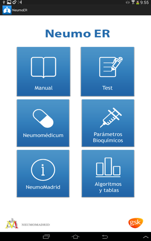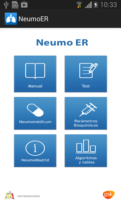 'NeumoER' is an application for mobile devices and tablets related to the handling of emergencies of respiratory origin, born of the Scientific Committee Neumomadrid and where you can find updated tools for diagnosis and treatment of the most prevalent diseases in the field respiratory receiving attention in any service or emergency center.