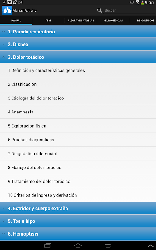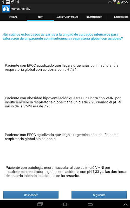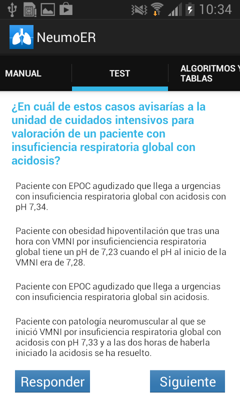 Operation is simple and comes with a dynamic and practical structure whose purpose is to give a quick questions arising in the acute management of the main respiratory diseases reply. It encourages learning by promoting effective diagnostic and therapeutic interventions.