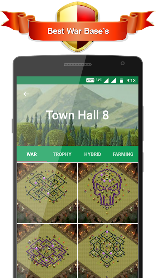 It is an Offline app that contains New Base Maps of COC village from Town Hall 1 to Town Hall 11 with 4 category War, Trophy, Hybrid and Farming.