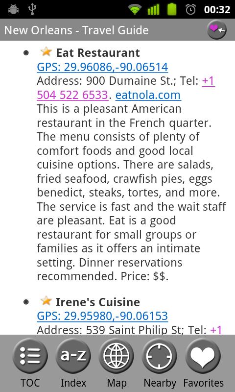 ✔ The top restaurants have been individually selected by MobileReference editors. These restaurants are marked by a star in the EAT chapter and are plotted on the GPS map.