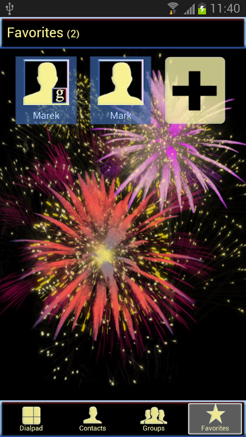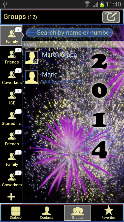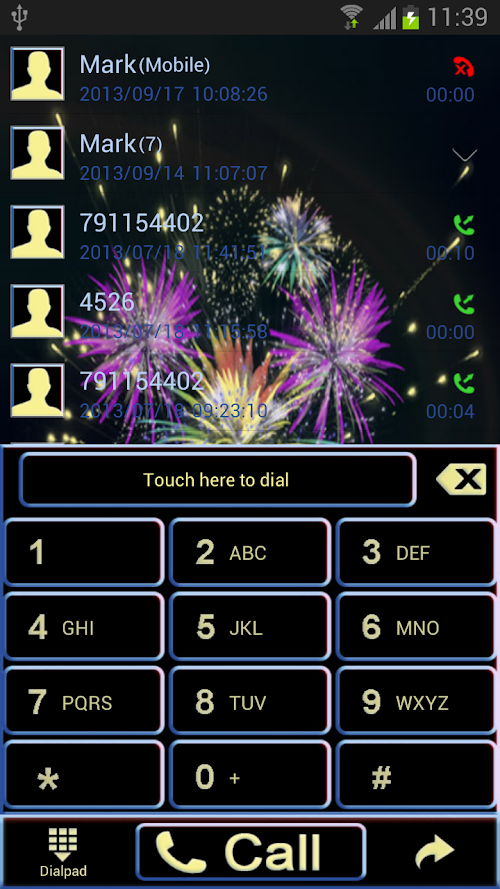 Motif with depicting exploding fireworks. Theme is designed to start the new year holiday. Picture shows the beauty of colorful exploding fireworks. Each contact list shows other fireworks. Contact names are blue, the date and time of the dark blue. Background is black keys, numbers and alphabet are in yellow. Other items are available in black and yellow. Do not wait until New Year's Eve, download now free of charge application.