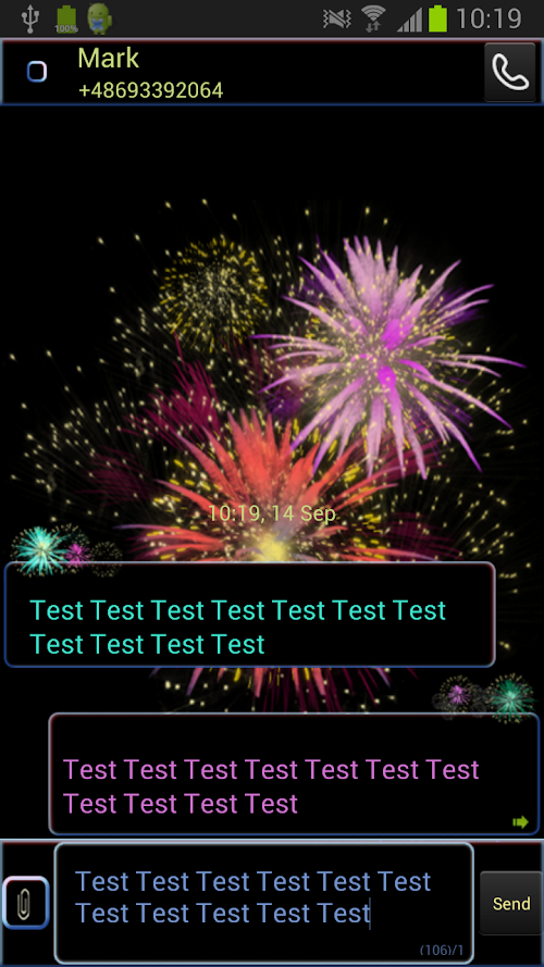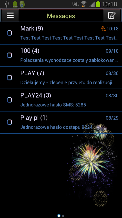 Are You ready for the end of the year? Stashed on fireworks already? Bought booze? Thinking where to go with Your another half? Then let the praparations also on to Your phone! Right now, completely for free You can download an astounding, colorful sms theme. Great, shiny fireworks on black, nightly sky. Burning with the myriads of colors. Red, yellow... Check how many off those colors You can find while texting Your friends and making plans for the New Year and upcoming Christmas. End of the year is a wonderful time of refreshing friendships, planing, getting Yourself not only intoxicated, but happier and carefree. It's time when You can finally have so much fun! When everyone make their own promises and wishes for the new year and start everything anew. And all of this going to be 'last year party' in the morning, when world wakes up to the new, fresh year. So prolong the fun and make Your message box as awesome as one can be!