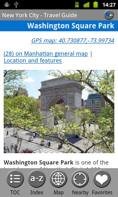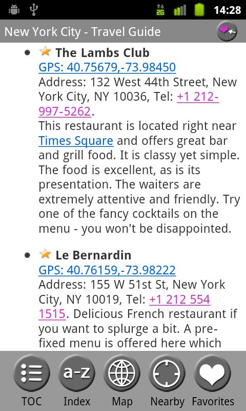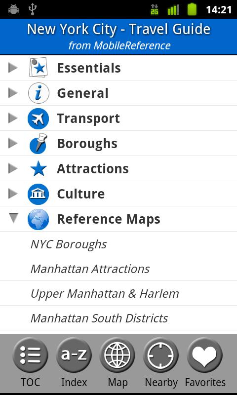 MobileReference Travel Guides provide detailed, practical information about attractions, landmarks, transportation, cultural venues, dining, lodging, history and much more. They are indexed alphabetically and by category, making it easier to access individual articles. Attractions can be viewed on an offline GPS map along with your current location so that you can easily find attractions near you as you explore the city.