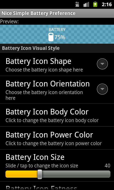 - Highly-customizable battery icon shape, color, size, fatness, and outline thickness