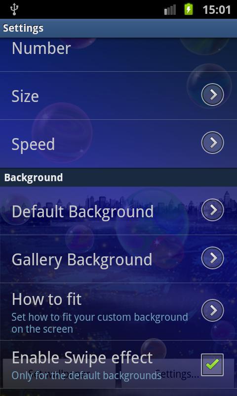 Settings: you can change the bubbles size, their number and their speed