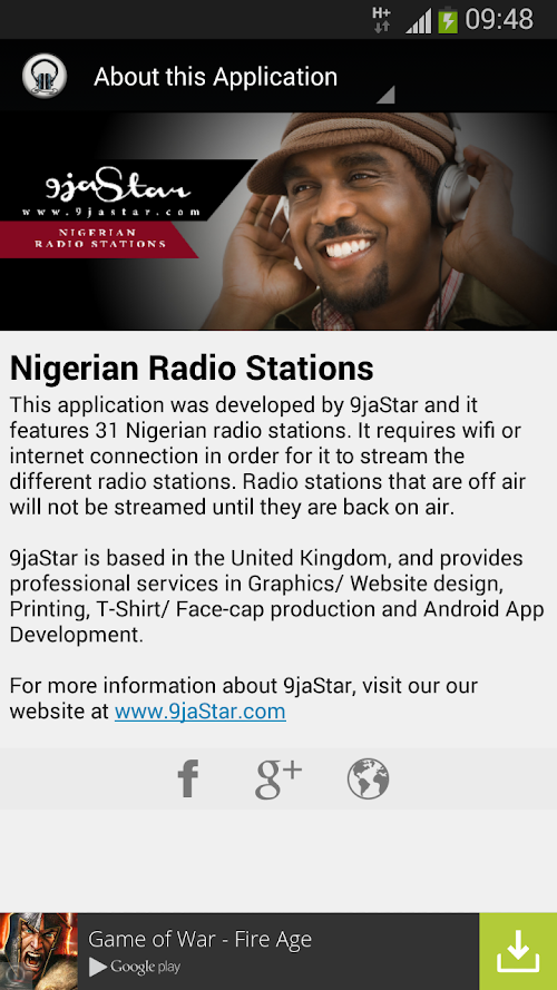 This application was developed to enable users listen to radio stations from Nigeria.