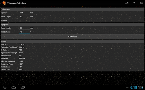 - Calculate angular separation, atmospheric refraction, magnitude, coordinate conversions, visual limiting magnitude, precession, redshift, and telescope airy disc, f-ratio and magnification