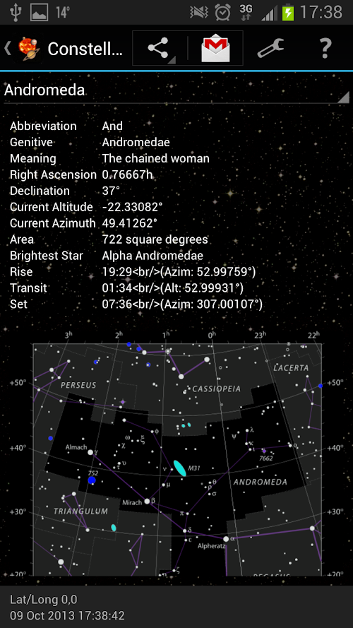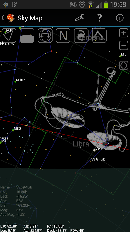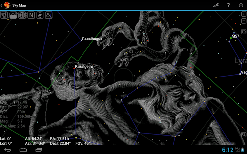The Sky Map makes use of the direction sensors of the device to show the sky above (or below you). Most of the features can be toggled in the settings. The Sky Map also allows you to turn on the device's camera to see the view behind the device with the sky map superimposed over it.