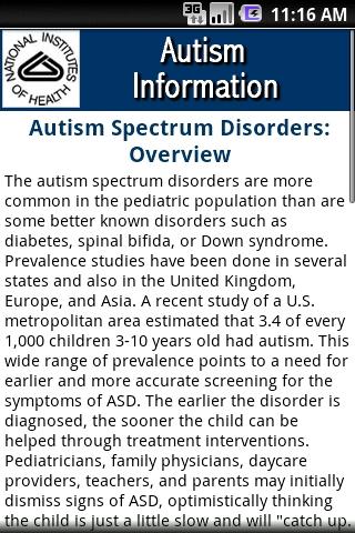 If someone you care about suffers from Autism, this application will come in very handy for every day use. All information contained is from the U.S. National Institutes of Health (NIH). Included, you'll find sections on: