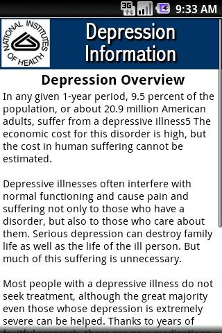 If you, or someone you care about suffers from Depression, this application will come in very handy for every day use. All information contained is from the U.S. National Institutes of Health (NIH). Included, you'll find sections on: