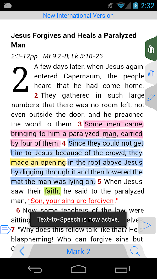 • Bible talks to you! Text-to-Speech allows the Bible to be read to you out loud