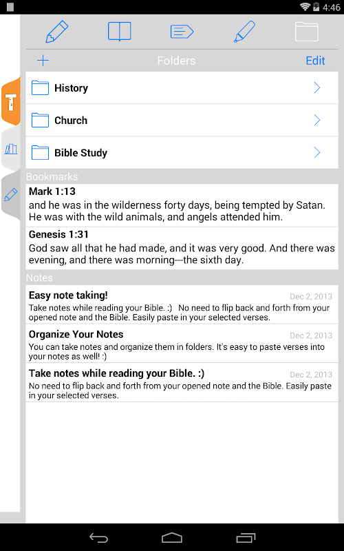 • Share verses & notes via Google+, Facebook, Twitter, email, & SMS