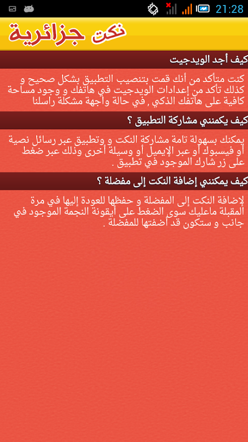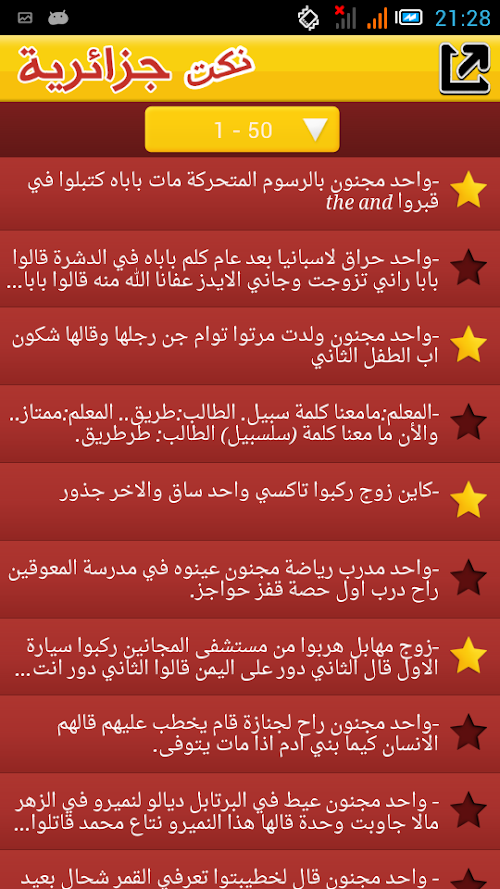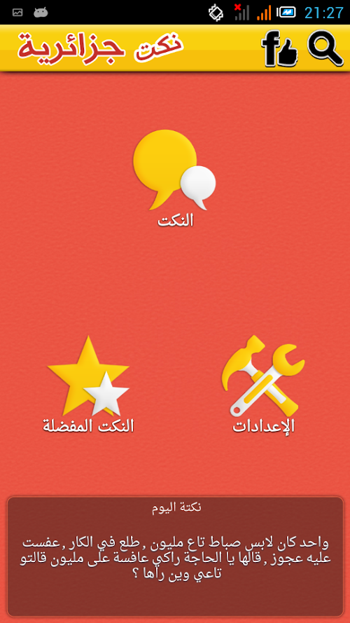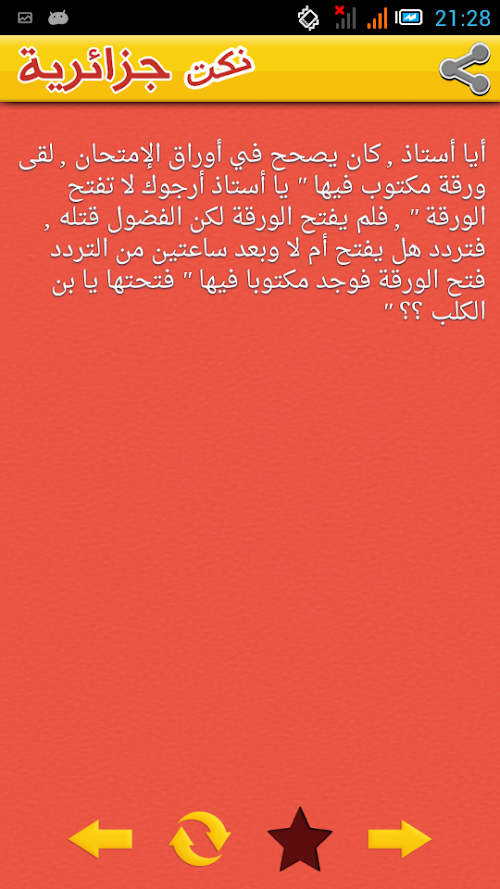 • share your fun to Facebook, Twitter, Email, Google+, Tumblr, t, Instagram, Path, WhatsApp, Line,all Algerian jokes in Arabic, very funny, very effective for stress or in a vacuum of time. it's a free application that contains 150 jokes (forever), nokat2014, Nokat 2015 algrienne