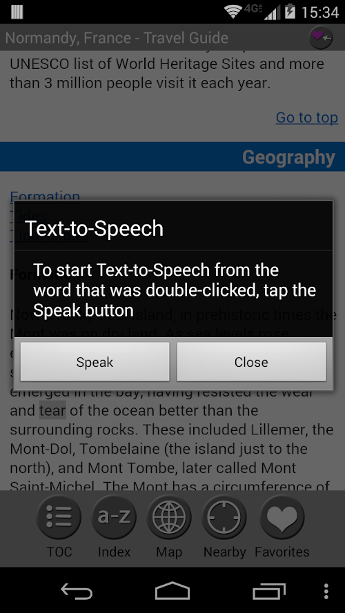 This fully-functional guide is absolutely free. The full version (only $4.99) adds Text-To-Speech and expands articles with more information about attractions, history, culture, itineraries, phrasebooks and more. Listen to complete articles on the go with Text-To-Speech: double-tap on a word to start Text-To-Speech from the selected word or select Menu > Start Text-To-Speech.