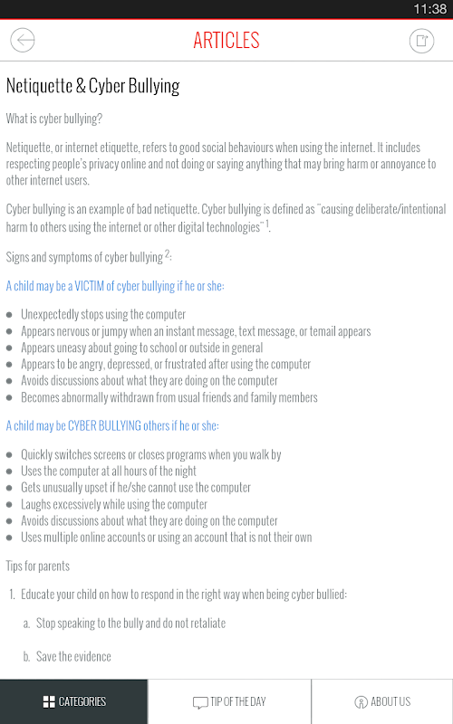 Designed for parents, you can now read from a plethora of articles on topics like gaming and mobile technology addiction, social media dos and don’ts, identifying cyber bullying, inappropriate content online and how to protect personal privacy online, on the go in a one-stop app.