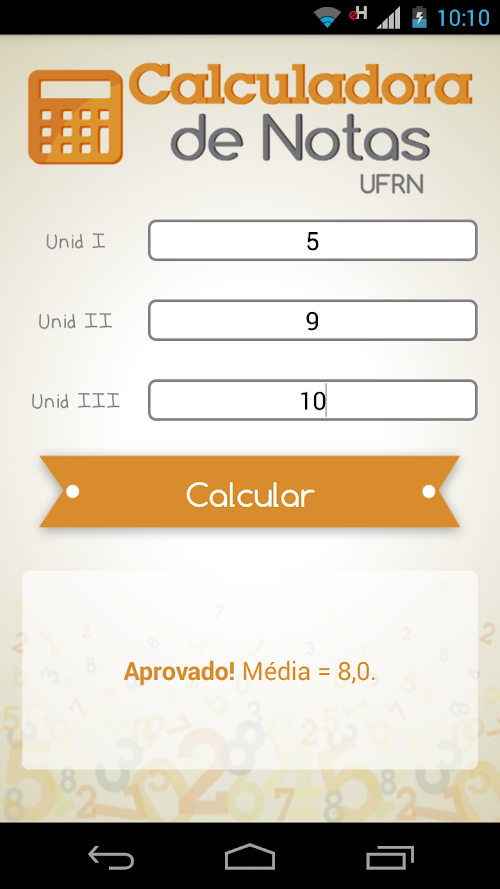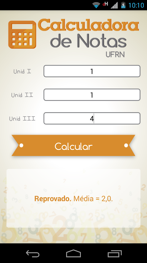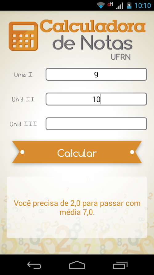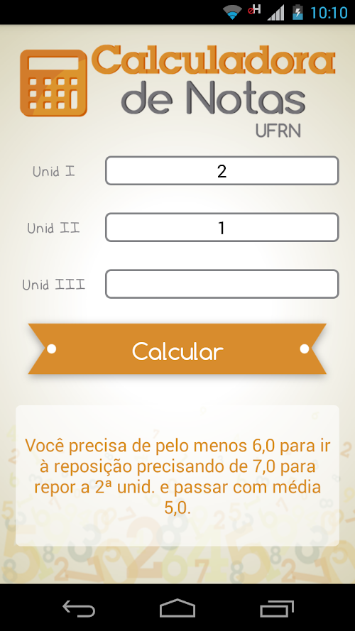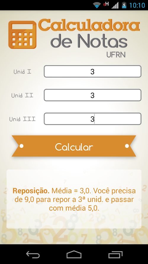 The calculator UFRN Notes - New Regulations and the essential app for all college students. In the system, the User can check their condition in its approval or disapproval in the disciplines of UFRN. With it, you can calculate how much a student will need in the last unit, the need in replacing (if necessary) or just make arbitrary calculations to know the system better. As the name suggest, all calculations take into account the new regulation UFRN (with respect to the evaluation system).